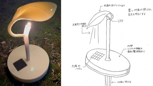 屋外利用を想定した自立型の照明提案であり、植物(芽)をモチーフにした造形と照射方向の工夫が特徴である。実装を意識した構成が評価され、電気学会四国支部賞として選定された。