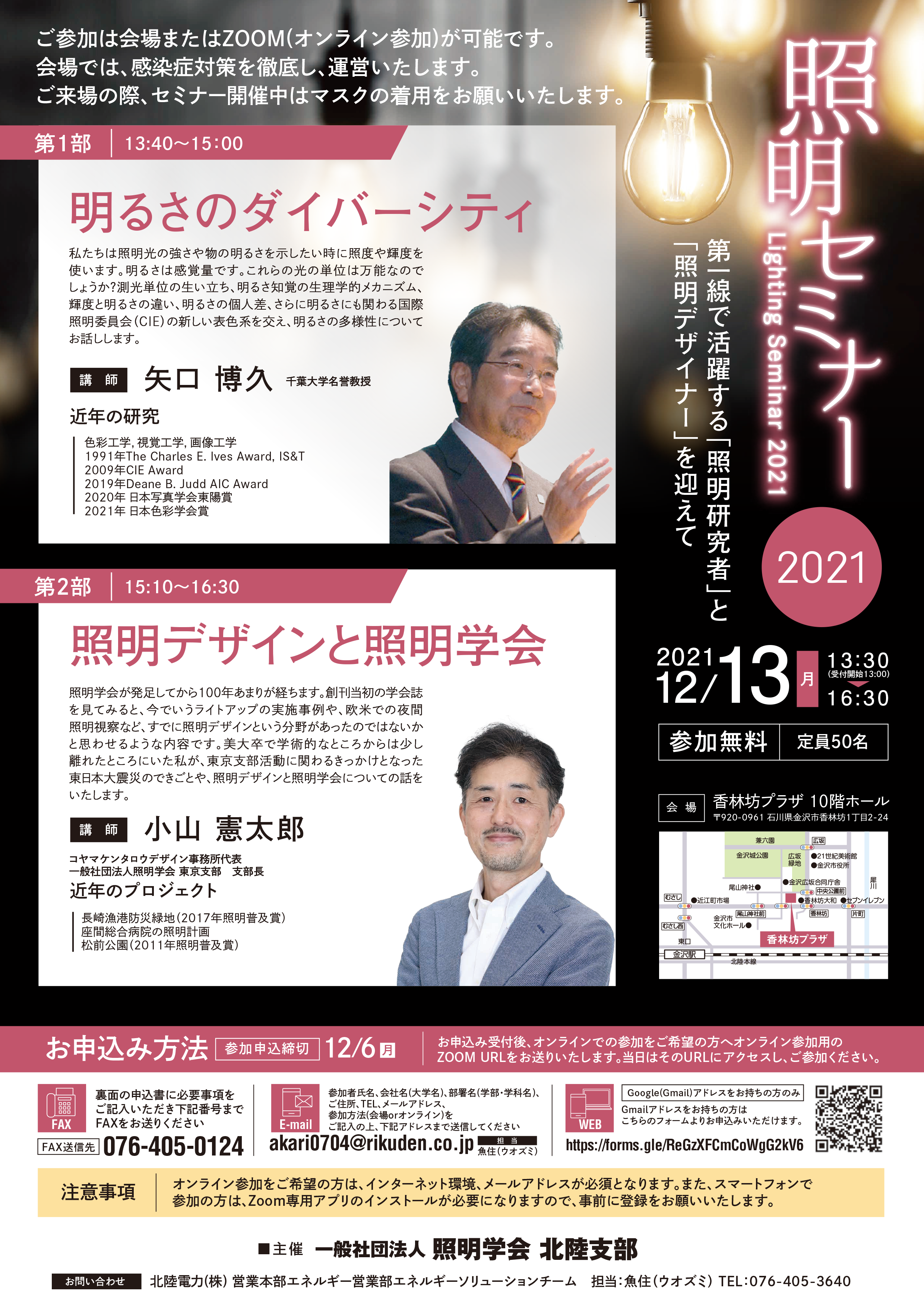 | 問合せ先 | 一般社団法人 照明学会 北陸支部事務局 TEL:076-405-3640/FAX 076-405-0124 Mail: akari0704(at)rikuden.co.jp (”(at)”を”@”に変更して下さい.) |