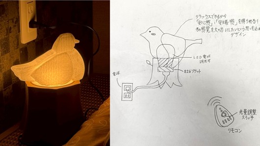 鳥の造形を用い、やわらかな光で安心感を与えることを狙った提案である。家庭内での使用を想定し、調光や取り扱いのしやすさにも配慮した構成が示された。